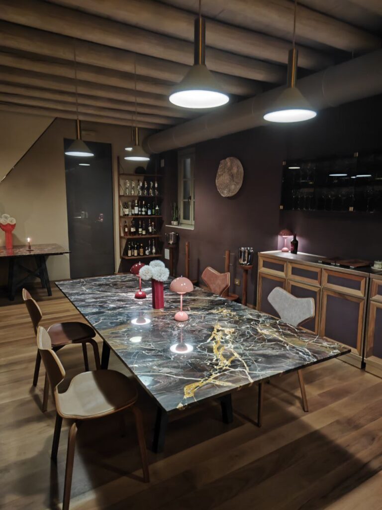 Le sale sono tre, una al pianoterra, con sei tavoli, una al piano di sopra, dove si gode della piccola pasticceria in relax dopo cena seduti in salotto, luogo che può diventare anche uno spazio riservato per un evento privato. Il piano interrato ospita un unico tavolo per cene esclusive.