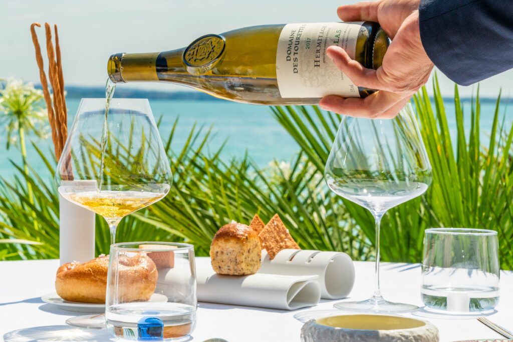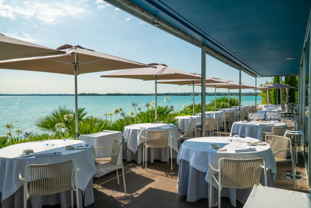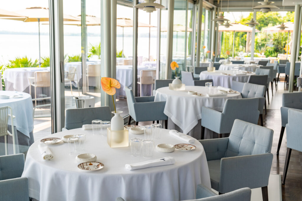 Curva dopo curva e poi un rettilineo: è semplice giungere a destinazione, il parcheggio è grande e non occorre passare per il centro storico di Sirmione, spesso affollato e con serie criticità di posteggio (fruibile, peraltro, solo fuori dalle mura). Indizi che mi mettono di buon umore. Appena varco la soglia del ristorante Tancredi, l’azzurro del lago mi riempie la vista. La luce entra dalle vetrate trasparenti e si riverbera sui tovagliati bianchi e sull’arredamento dai toni molto chiari. Il sorriso del patron Arnaldo Damiani, dal savoir faire impeccabile, ci accoglie con simpatia.
